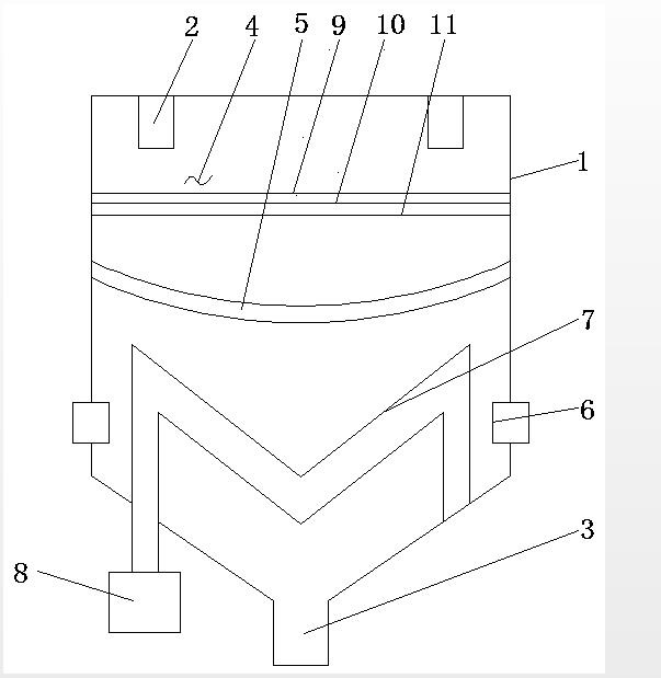 附图中各部件的标记如下:1、筒体,2、进料口,3、出料口,4、过滤网,5、引流板,6、螺旋桨,7、封闭加热管路,8、加热源,9、粗滤网,10、中间活性炭层,11、细滤网。